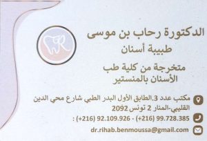 Adresse: 53 Av Mohieddine Klibi, El Badr Médical, immeuble Bader Ettebi, App N°3, 1er étage, El Manar 2, Tunis.