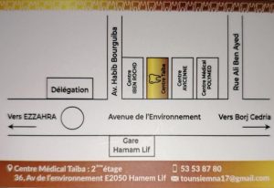 Adresse: 36 Avenue de l’environnement, centre médical Tiba, 2ème étage, Hammam Lif, Ben Arous.