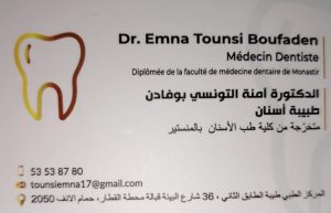 Dr Emna Tounsi Boufaden médecin dentiste à Hammam Lif, traite dans son cabinet dentaire les pathologies des dents, des gencives et de la mâchoire.