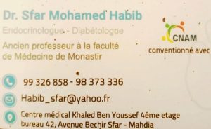 Dr Mohamed Habib SFAR endocrinologue et diabétologue à Mahdia conventionné avec La CNAM, ancien professeur à la faculté de Médecine de Monastir.
