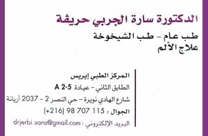 الدكتورة سارة الجربي حريڨة أخصائية طب عام و طب الشيخوخة بحي النصر، أريانة