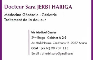 Dr Sara JeERBI ép HARIGA médecin généraliste et gériatre à Cité Ennasr 2, spécialiste en médecine générale avec compétences en gériatrie.