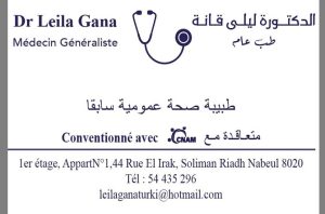 Dr Leila GANA médecin généraliste à Borj Cedria – Soliman Erriadh, diplômée de la faculté de médecine de Monastir, spécialiste en médecine générale.