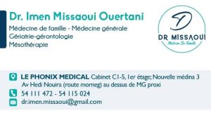 Dr Imen Missaoui Ouertani médecin de famille et médecin généraliste à El Yasminette, Nouvelle Medina, intervient aussi dans son cabinet de médecine générale dans le domaine de gériatrie et mésothérapie.