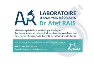 Laboratoire d’analyses médicales à Megrine du Dr Afef Rais, médecin biologiste et ancienne assistante hospitalo-universitaire à l’institut Pasteur de Tunis et à la Faculté de Médecine de Tunis.