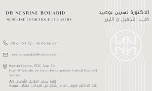 Cabinet de Laser et médecine esthétique à Sousse du Dr Nesrine BOUABID; médecin esthétique diplômé en dermatologie esthétique, cosmétologie et Lasers de la faculté de médecine de Sousse.