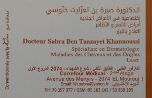 Dr Sabra Ben Taazayet Khannoussi Dermatologue et médecin esthétique à Ben Arous – El Mourouj 1, spécialiste en dermatologie et médecine sthétique.