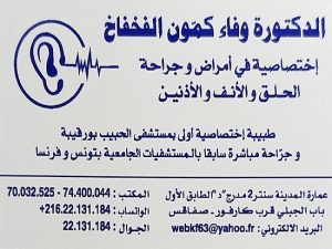 ORL à Sfax Dr Wafa Kammoun Fakhfakh est spécialiste en Oto-Rhino-Laryngologie et chirurgie cervico-faciale, ancienne attachée des hôpitaux de Tunis et de France.