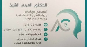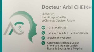 Dr Arbi Cheikh est un médecin ORL à Megrine spécialiste en Oto-Rhino-Laryngologiste, chirurgie cervico-faciale et la sphère ORL: nez, gorge, oreilles et cou.
