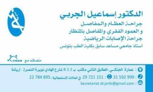 Dr Ismail JERBI Traumatologue et Chirurgien orthopédiste à Ariana – Ennasr 2, ancien assistant Hôspitalo-Universitaire à la faculté de médecine de Tunis.