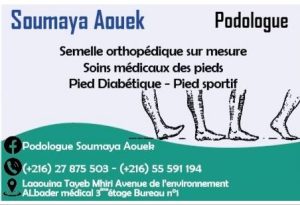 Soumaya Aouek pédicure podologue à L’Aouina – cité El Wahat à proximité de Ain Zaghouan et La Soukra, accueille ses patients dans son cabinet de podologie et de pédicurie médicale.